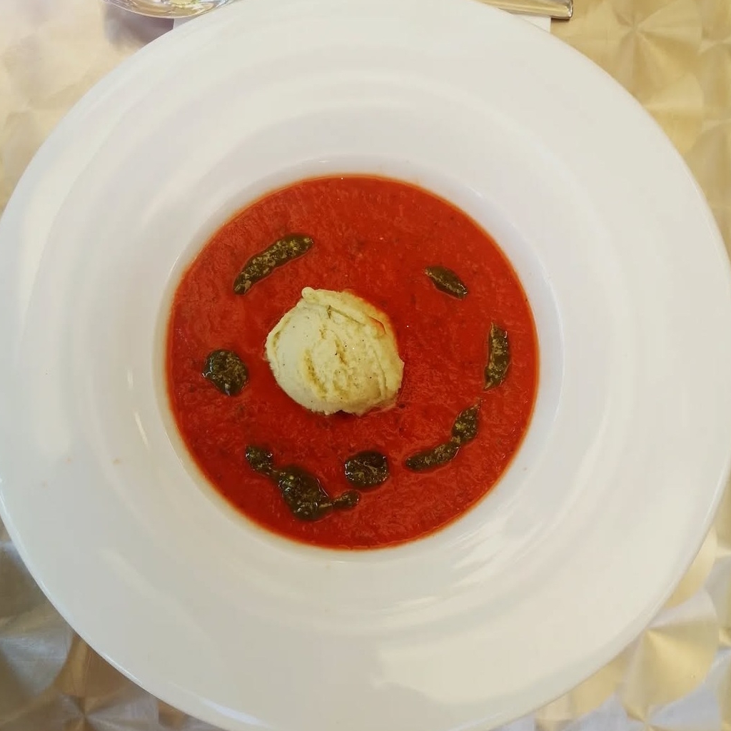 / Tomaten-Suppe, Ziegenfrischkäse, Basilikum-Pesto, Fladenbrot
